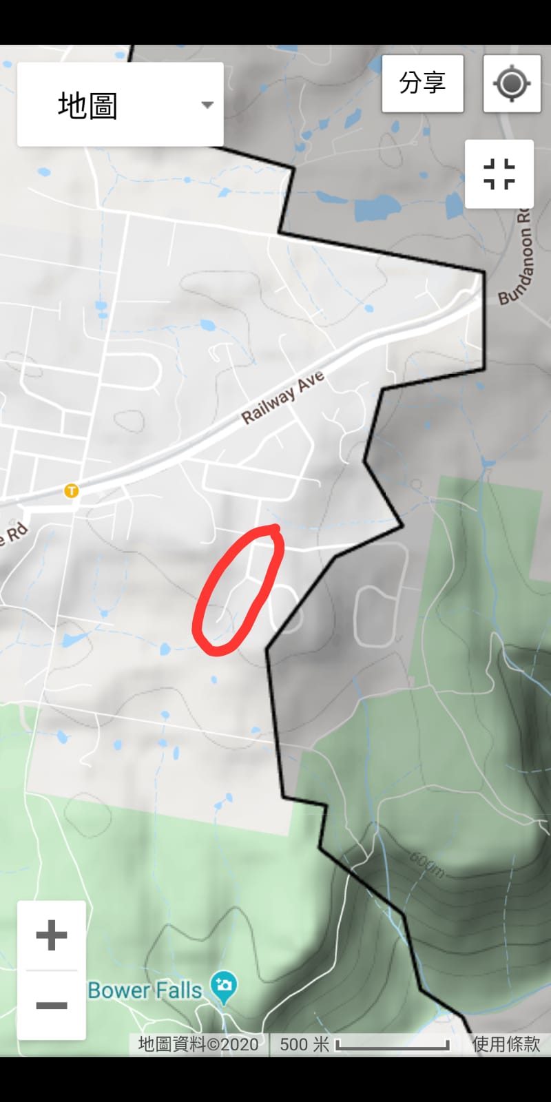 紅圈是老師房子的位置,深灰色地帶便是被火燒過的區域。